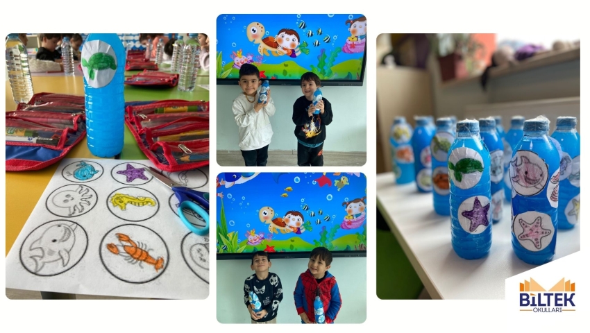 Anaokulu 4 yaş grubu öğrencilerimiz, pet şişelerle kendi minik akvaryumlarını oluşturdu; renkleri keşfederken hem eğlendi hem öğrendi.
