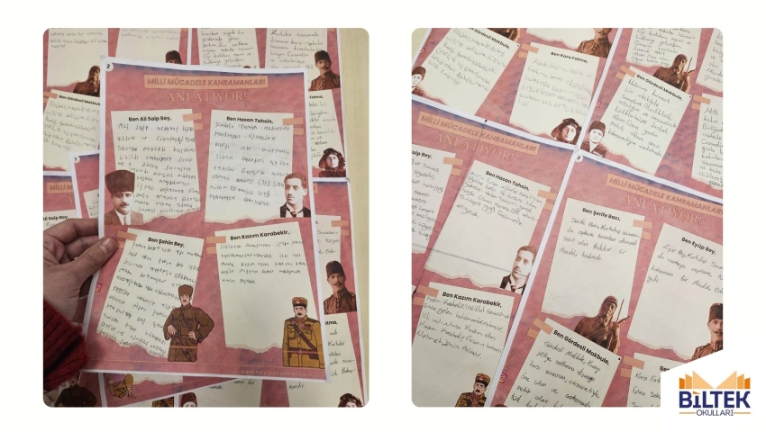 Öğrencilerim, Millî Mücadele’nin cesur kadınlarını araştırıp kendi cümleleriyle kartlara yazdılar, ardından da birbirinden güzel sunumlarla sınıfımızı adeta bir tarih sahnesine çevirdiler.
