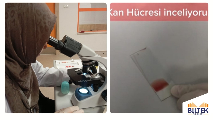 9.sınıf öğrencilerimiz, mikroskop altında taze kan örneklerini inceleyerek alyuvar, akyuvar ve trombositleri gözlemledi. Uygulama sayesinde kanın hücresel yapısını teorik bilginin ötesinde deneyimlediler.
