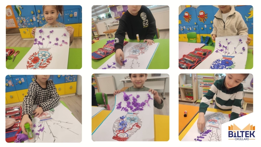 Görsel sanatlar dersinde 4 ve 5 yaş grubu öğrencilerimizle çini sanatını kolaj çalışmasıyla buluşturduk. Minik eller, renkler ve desenlerle hem geleneksel bir sanatı tanıdı hem de kendilerini özgürce ifade etme fırsatı buldu. Bu keyifli etkinlik sayesinde öğrencilerimizin ince motor becerileri, estetik algıları ve hayal güçleri desteklendi.