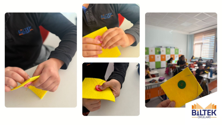 Biltek Okulları 2. sınıf öğrencileri bugün el becerilerini geliştirmek için keyifli bir etkinlik gerçekleştirdi. Öğrenciler, öğretmenlerinin rehberliğinde düğme dikmeyi öğrenerek hem el-göz koordinasyonlarını geliştirdi hem de sabırla çalışmanın önemini keşfetti.