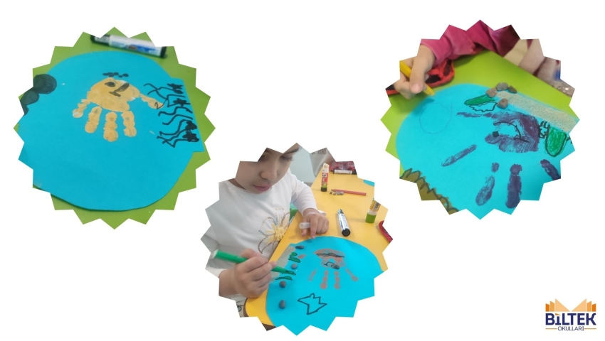 Öğrencilerimiz kum, taş ve doğal malzemelerle üç boyutlu akvaryum tasarımları yaptı; el baskısı tekniğiyle çalışmayı tamamlayarak hayal güçlerini ve ince motor becerilerini geliştirdi.
