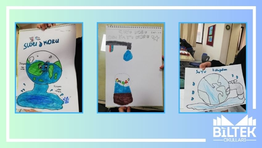 Öğrencilerimizle suyun yaşamımızdaki önemini ele aldık. Su tüketimi ve su verimliliği konusunda mesaj veren, düşündüren resimler hazırlayarak hayal güçlerini ve ifade becerilerini ortaya koydular.