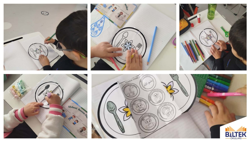 Ahlak ve inanç dersimizde “yemek yeme adabı” konusunu işleyerek defterimize eğlenceli bir etkinlik hazırladık. Kalıcı öğrenme ve değerli defterimizi süsleme amaçlı çalışmalarımız devam ediyor.