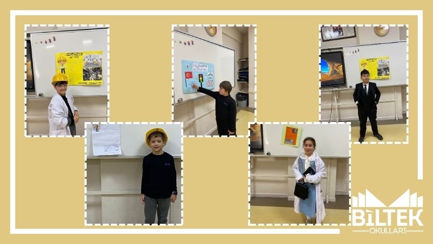 Polislikten mühendisliğe, doktorluktan iş insanlığına kadar birçok meslek dalını araştıran öğrencilerimiz; hazırladıkları sunumlar ve kostümlerle arkadaşlarına meslekleri tanıttılar.