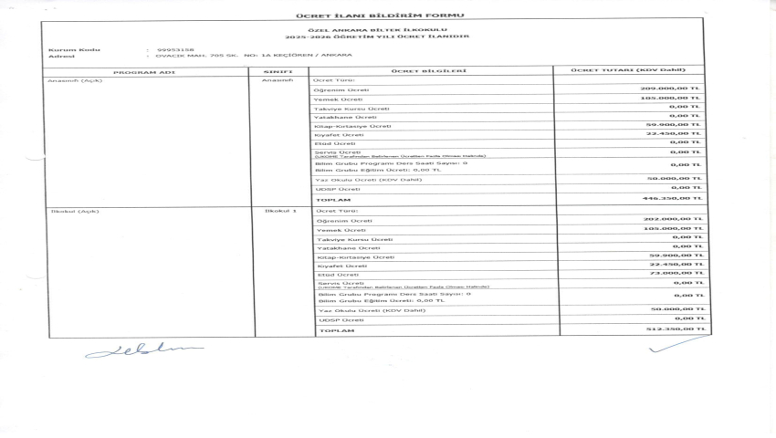 ÖZEL ANKARA BİLTEK İLKOKULU ÜCRET İLANI