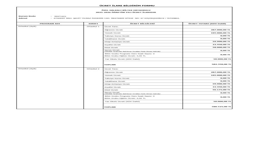 ÖZEL HALKALI BİLTEK ORTAOKLU ÜCRET İLANI