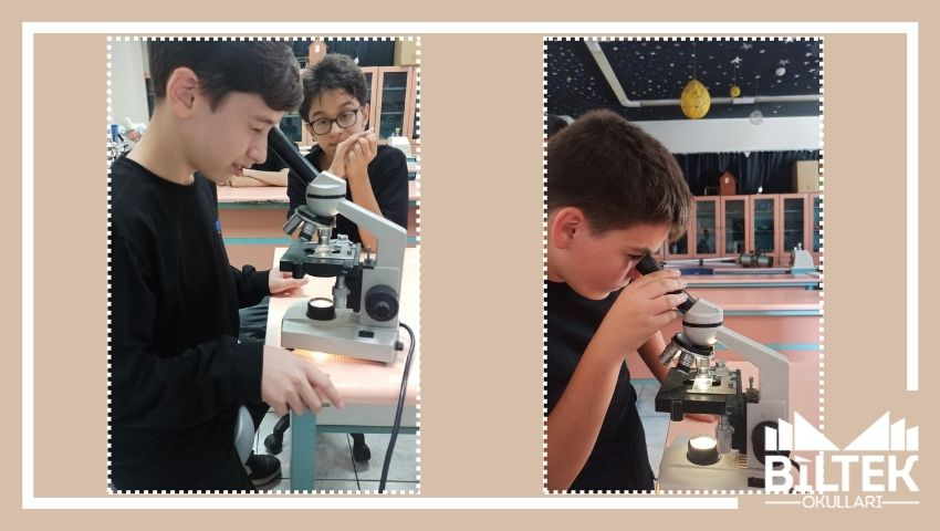 Biltek Ortaokulu öğrencileri, Fen Bilimleri dersinde bitki hücresini mikroskop altında detaylı bir şekilde inceleyerek uygulamalı bir deneyim yaşadı. Hücrenin yapısını ve işlevlerini gözlemleyerek öğrenen öğrenciler, teorik bilgilerini pratiğe dökme fırsatı buldu ve bilimsel süreçleri bizzat deneyimledi.