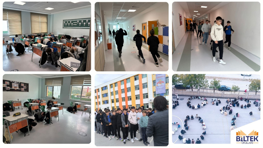 Tüm kademelerde yapılan deprem tatbikatında öğrencilerimiz," Çök-Kapan-Tutun" uygulamasıyla afet bilincini kazandı ve güvenli bir şekilde tahliye etti