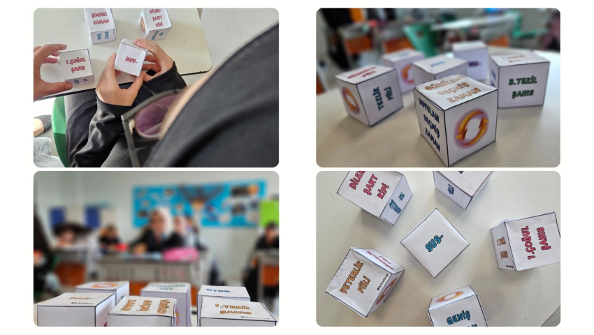 Ortaokul öğrencilerimiz, Türkçe dersinde öğretmenleri tarafından hazırlanan “Fiil Kipleri Küp Oyunu” ile fiil kiplerini ve şahıs eklerini eğlenceli bir şekilde pekiştirdiler. Renkli küplerle gerçekleşen etkinlikte öğrenciler keyifle öğrenmenin tadını çıkardılar.