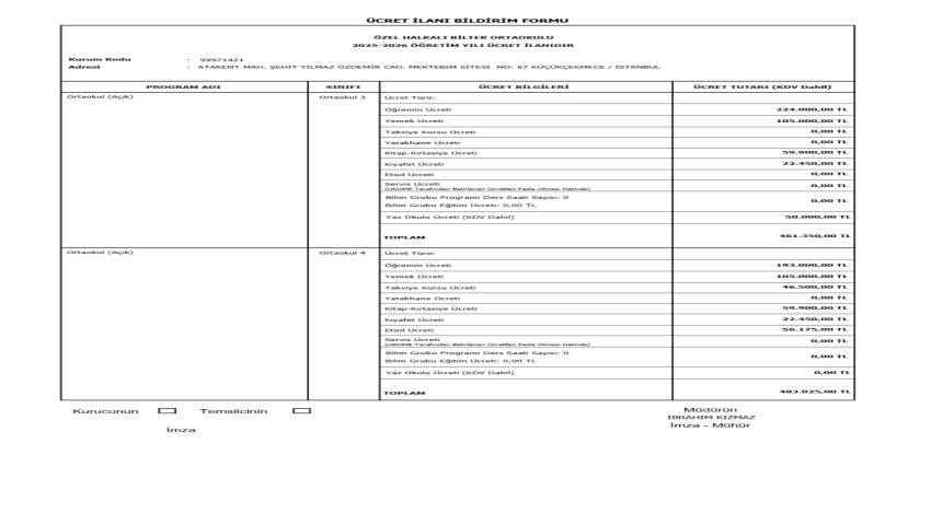 ÖZEL HALKALI BİLTEK ORTAOKLU ÜCRET İLANI