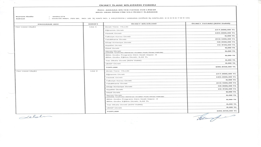 ÖZEL ANKARA BİLTEK FAYDA FEN LİSESİ ÜCRET İLANI