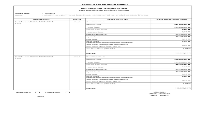 ÖZEL HALKALI BİLTEK LİSESİ ÜCRET İLANI
